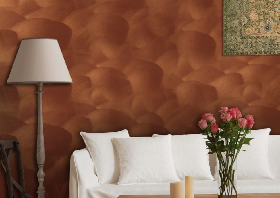 A metal effect look could be achieved with this metallic plaster which is available in different bases ( Gold , Silver and Copper ) It Is a washable product and is only used for the interior. These bases could also be tinted with different colours resulting in spectacular effects.
